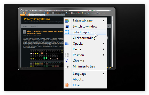 2. Pod opcją Select region mamy możliwość zaznaczenia fragmentu śledzonego okna. Przywołujemy na plan pierwszy okno aplikacji, z którego chcemy wyciąć fragment. Tym razem z menu podglądu, prawym przyciskiem myszy i wybieramy Select region.